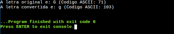printf("A letra convertida e: %c (Codigo ASCII: %d)\n", letraMinuscula, letraMinuscula);