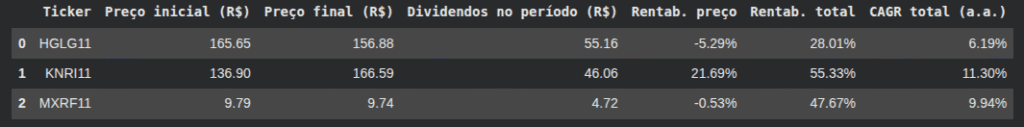 tickers = ["HGLG11.SA", "KNRI11.SA", "MXRF11.SA"]