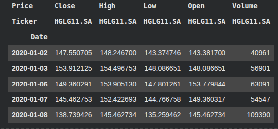 A primeira coisa que devemos fazer é escolher algum FII. Por familiaridade, irei escolhei o HGLG11, mas sinta-se a vontade para escolher qualquer FII’s que quiser analisar, somente lembre-se que deverá usar o sufixo .SA, assim: HGHLG.SA. Escolhido o fundo imobiliário, iremos então implementar o trecho de código que busca essas informações na B3, conforme é apresentado abaixo.