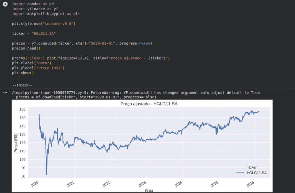 Dessa maneira, iremos complementar esse código pegando o preço ajustado e plotando um gráfico mostrando como oscilou o preço desse ativo durante desde do ano de 2020 até o presente(2026).