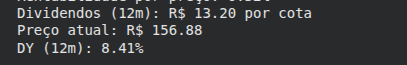 print(f"Dividendos (12m): R$ {div_12m:.2f} por cota")