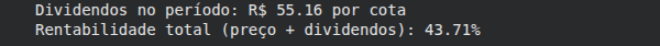 print(f"Dividendos no período: R$ {div_periodo:.2f} por cota")