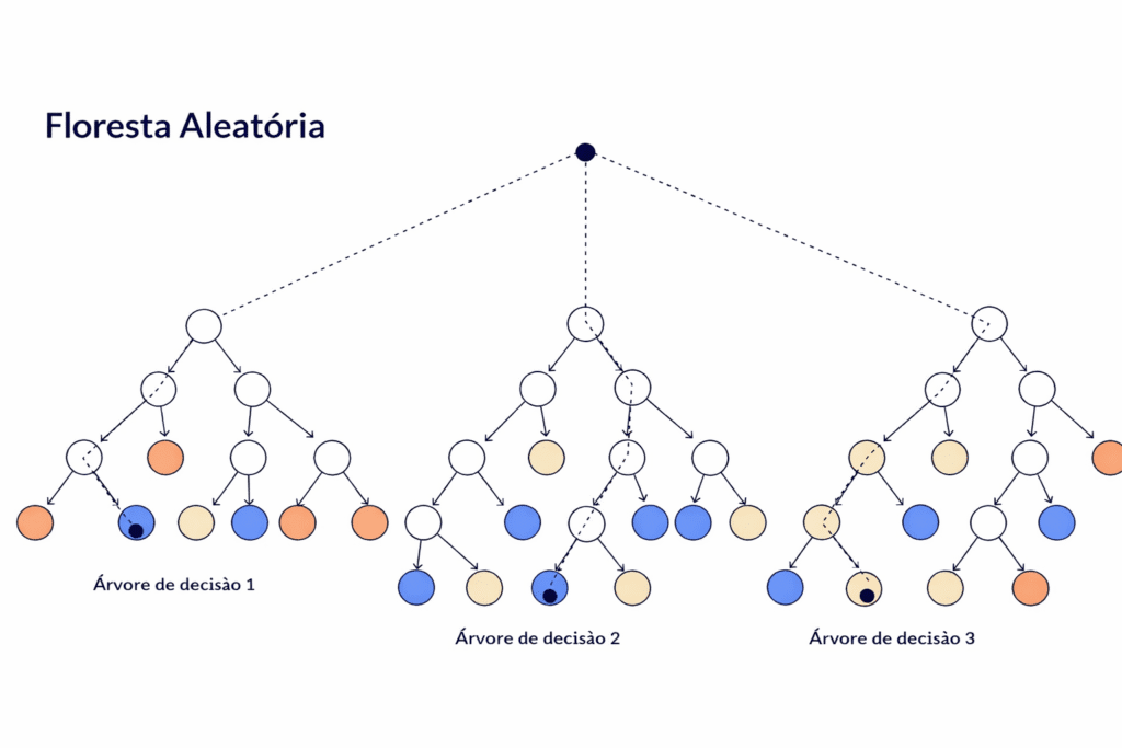 Como o próprio nome sugere, o algoritmo constrói uma floresta composta por múltiplas árvores de decisão. Cada árvore na floresta é treinada de forma ligeiramente diferente das outras, o que garante diversidade entre elas. Quando chega o momento de fazer uma predição, todas as árvores da floresta “votam” e a decisão final é tomada pela maioria. Esse mecanismo de votação é o que confere ao algoritmo sua robustez excepcional.